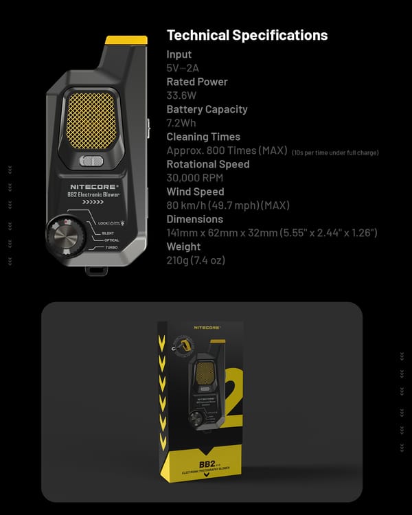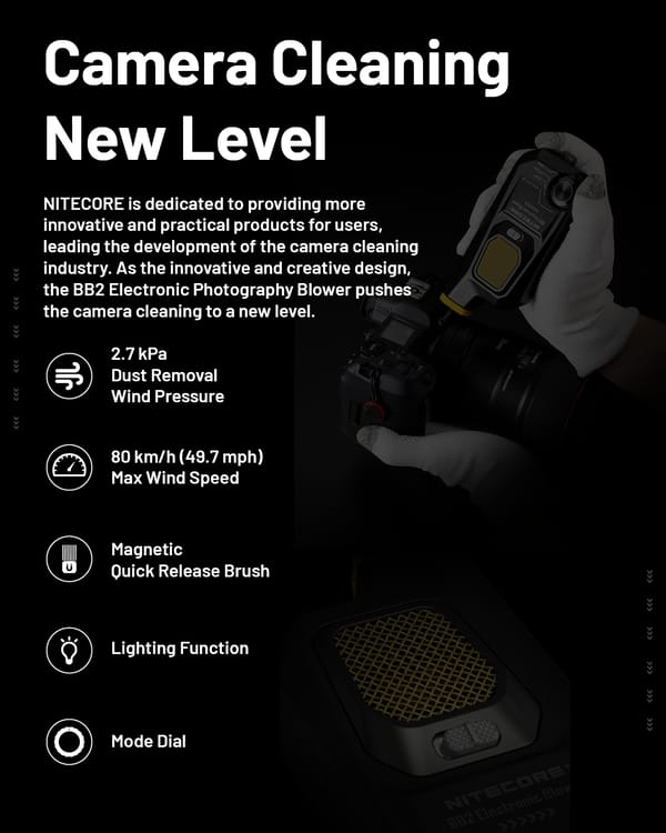 【Powerful Cleaning Performance:】 Delivers a high-speed wind output of up to 80 km/h (49.7 mph) with a 33.6W motor and 2.7 kPa wind pressure, perfect for removing dust from camera lenses, sensors, and other photography gear.